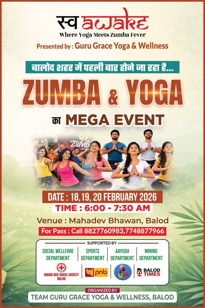 बालोद शहर में पहली बार टीम गुरु ग्रेस योगा एंड वैलनेस द्वारा आयोजित होने जा रही योग और जुंबा का तीन दिवसीय मेगा इवेंट इसका नाम है “स्व AWAKE” जिला प्रशासन के विशेष पहल एवं सहयोग से महादेव भवन प्रांगण में 18 फरवर...