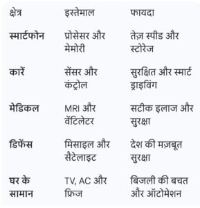 “बिना सेमीकंडक्टर के आधुनिक दुनिया की कल्पना करना असंभव है। इन्हें ‘आधुनिक युग का नया तेल’ भी कहा जा सकता है। यहाँ इसके कुछ प्रमुख उपयोग दिए गए हैं।”