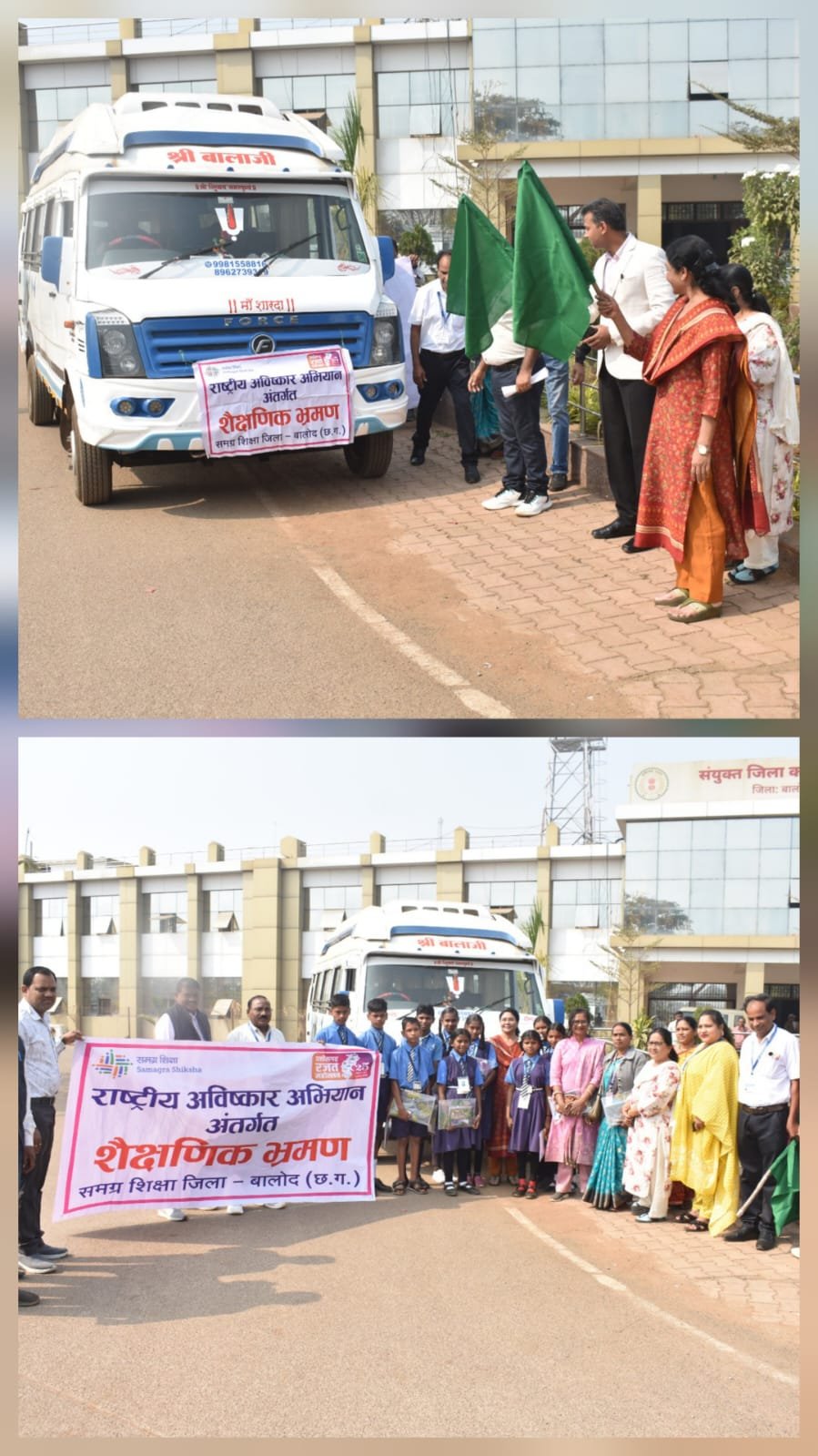 कलेक्टर दिव्या उमेश मिश्रा एवं जिला पंचायत के मुख्य कार्यपालन अधिकारी श्री सुनील चंद्रवंशी ने आज संयुक्त जिला कार्यालय परिसर में सुबह 10 बजे हरी झण्डी दिखाकर राष्ट्रीय आविष्कार अभियान अंतर्गत बालोद टेक्नोफेस्ट के टाॅप टेन प्रतिभागी छात्र-छात्राओं को शैक्षणिक भ्रमण के लिए रवाना किया। इस अवसर पर उन्होंने शैक्षणिक भ्रमण हेतु बस को हरी झण्डी दिखाकर रवाना किया तथा छात्र-छात्राओं की उज्ज्वल भविष्य की कामना करते हुए उन्हें हार्दिक बधाई एवं शुभकामनाएं दी। समग्र शिक्षा के जिला मिशन समन्वयक ने बताया कि राष्ट्रीय आविष्कार अभियान अंतर्गत इस शैक्षणिक भ्रमण कार्यक्रम के तहत बालोद टेक्नोफेस्ट में भाग लेने वाले जिले के टाॅप टेन छात्र-छात्राएं आज नागपुर स्थित रमन विज्ञान केन्द्र, महाराजाबाग जू और रेल संग्रहालय का भ्रमण करेंगे। इस अवसर पर ए.पी.सी. समग्र शिक्षा सहित अधिकारी-कर्मचारी एवं शिक्षक-शिक्षिकागण उपस्थित थे।