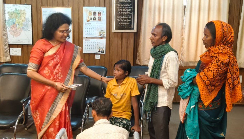 कलेक्टर श्रीमती दिव्या उमेश मिश्रा ने आज संयुक्त जिला कार्यालय स्थित अपने कक्ष में गुण्डरदेही विकासखण्ड के ग्राम खर्रा के दिव्यांग बालिका कुमारी रीना निषाद को कृत्रिम पैर एवं वाॅकर प्रदान कर उन्हें शुभकामनाएं दी। इस दौरान कलेक्टर श्रीमती मिश्रा ने दिव्यांग बालिका कुमारी रीना एवं उनके परिजनों से कुशलक्षेम भी पूछा। श्रीमती मिश्रा ने दिव्यांग बालिका कुमारी रीना को पूरे मनोयोग से विद्या अध्ययन करते हुए जीवन में उलपब्धि हासिल करने की समझाईश भी दी। इस दौरान उन्होंने दिव्यांग बालिका कुमारी रीना के पैरों का भी अवलोकन किया। इस मौके पर समाज कल्याण विभाग के उप संचालक श्री अजय गेडाम सहित अन्य अधिकारी-कर्मचारी उपस्थित थे।