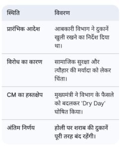 शुष्क दिवस (Dry Day): अब होली के दिन पूरे प्रदेश में शराब की सभी सरकारी दुकानें, बार और क्लब पूरी तरह बंद रहेंगे।