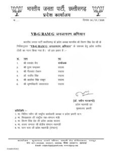 ‘VB-G RAM G’ जनजागरण अभियान के माध्यम से भारतीय जनता पार्टी प्रदेश के प्रत्येक नागरिक तक पहुँचने की योजना बना रही है। इस अभियान का मुख्य लक्ष्य सरकार की नीतियों, जनकल्याणकारी योजनाओं और सांस्कृतिक मूल्यों को जन-जन तक पहुँचाना है। प्रदेश स्तरीय टोली इस पूरे अभियान के समन्वय (Coordination) और रणनीति निर्धारण का कार्य करेगी।