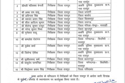 रायपुर। छत्तीसगढ़ की राजधानी रायपुर में पुलिस प्रशासन ने कानून व्यवस्था को और अधिक सुदृढ़ बनाने के उद्देश्य से निरीक्षक स्तर के अधिकारियों के प्रभार में बड़ा फेरबदल किया है। पुलिस कमिश्नर कार्यालय, रायप...