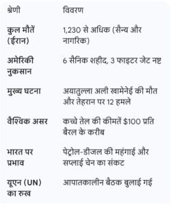 ईरान: लगभग 1,230+ लोग मारे जा चुके हैं (सैन्य और नागरिक मिलाकर)।