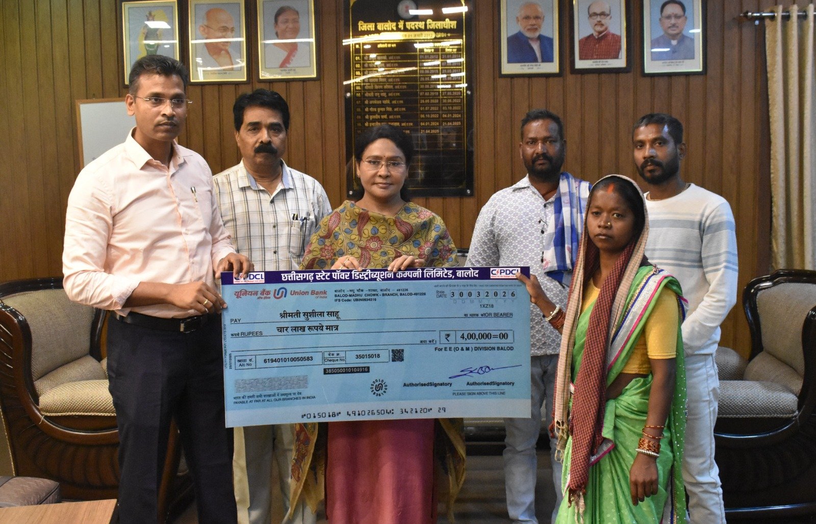 बालोद, 30 मार्च 2026 कलेक्टर श्रीमती दिव्या उमेश मिश्रा ने आज संयुक्त जिला कार्यालय स्थित अपने कक्ष में विद्युत दुर्घटना में मृत श्री ईश्वर साहू के उत्तराधिकारी श्रीमती सुशीला बाई को 04 लाख रुपये की आर्थिक सहायता राशि का चेक प्र...